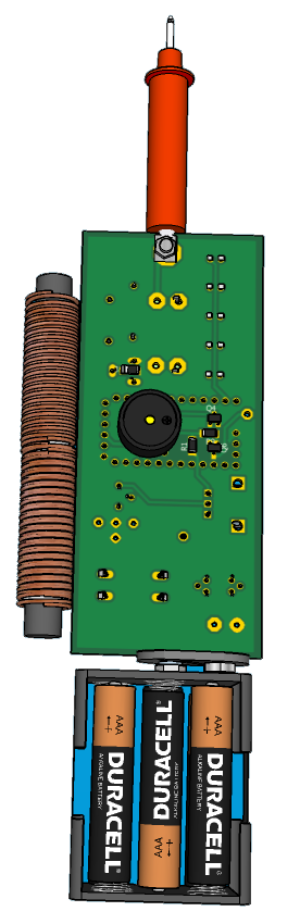 Катушки для определения металла L1,L2 намотаны на ферритовом стержне (такие применяются в транзисторных приемниках) длинной 4-5 см и диаметром 10мм. Катушки мотаются одна поверх другой и содержат по 200 витков изолированного медного провода ~0.2 мм. Необходимо соблюдать полярность подключения, поэтому в случае отсутствия генерации (частота 15-20 кгц) необходимо поменять концы любой из обмоток. Допускаются изменения параметров катушки -провод, длинна и диаметр стержня.