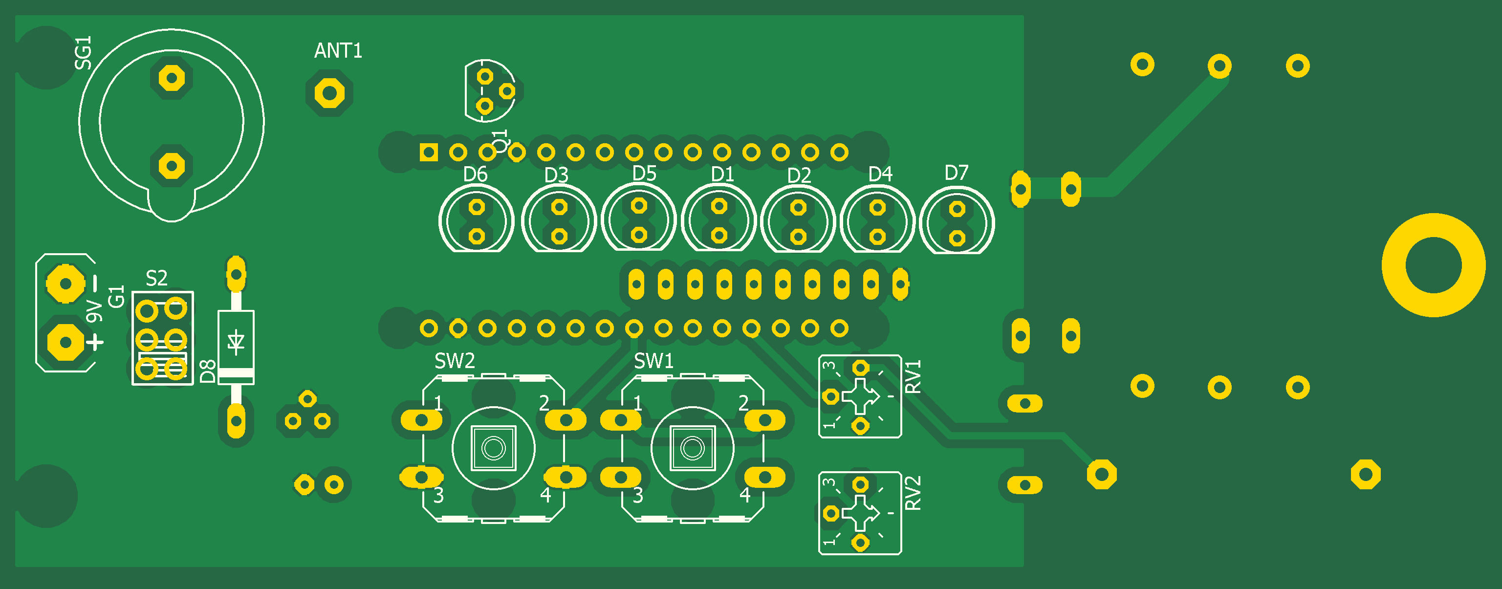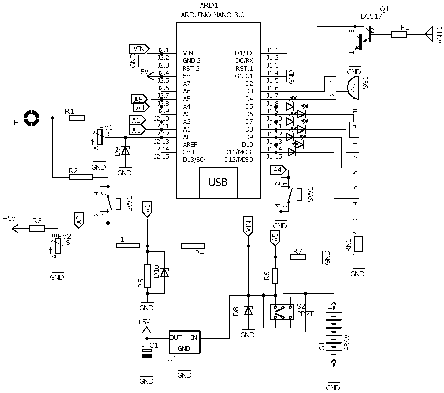 В режиме поиска скрытой проводки напряжение с антенны поступает на базу транзистора Дарлингтона Q1. Коллектор транзистора подключен к входу D2 модуля Ардуино. Если частота сигнала в диапазоне 40 - 60Гц, срабатывает зуммер. Таким образом осуществляется цифровая фильтрация частоты сети 50Гц.