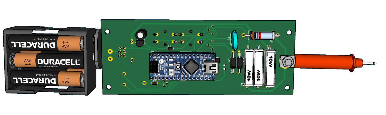 Для прозвонки цепи необходимо замкнуть кнопку SW1. При этом между сопротивлением R4 и прозваниваемой цепью образуется напряжение, которое поступает на вход АЦП А1 модуля Ардуино. Позвонка начинает срабатывать при сопротивлении цепи между входом щупа и общим менее 120 Ом. Порог срабатывания прозвонки устанавливается подстроечником RV2. Если случайно нажать на кнопку SW1 при подключении пробника к сети переменного тока, срабатывает зуммер SG1 и через 2сек. отключается самовосстанавливающийся предохранитель F1. Таким образом осуществляется защита цепи прозвонки.