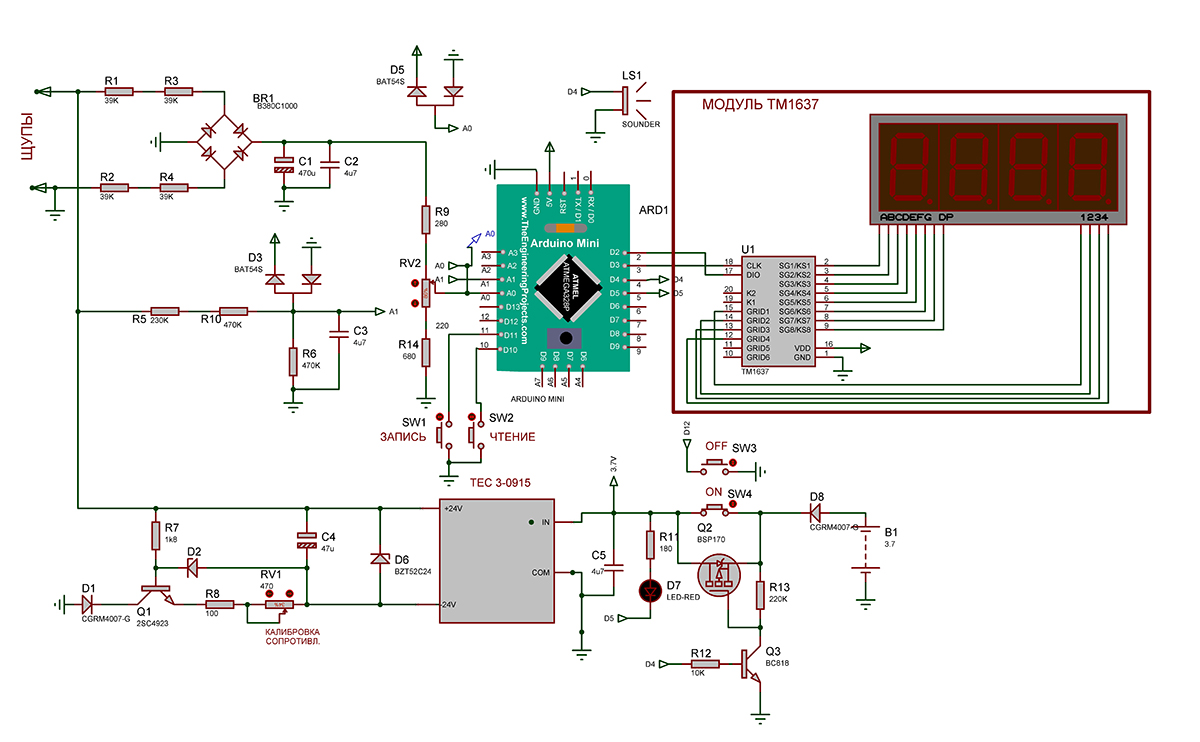 Переменное напряжение с щупа через цепи R1, R3, R2 , R4, поступает на выпрямительный мост BR1 , выпрямляется и сглаживается конденсаторами С1, С2 и через делитель R9,RV2, R14 поступает на аналоговые входы А0,А1 Ардуино Мини. Калибровка напряжения осуществляется подстроечным резистором RV2.