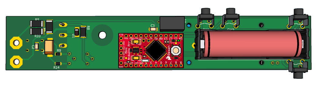 Для записи измеряемого значения напряжения или сопротивления необходимо нажать кнопку SW1, для последующего просмотра нажать SW2. Для питания пробника применен цилиндрический Li-Ion аккумулятор 3,7V CRAA. Питание включается кнопкой ON, выключается кнопкой OFF. Скетч для Ардуино Мини выполнен в среде FLPROG 7.3.8.