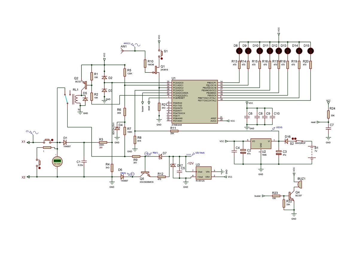 Переменное напряжение на Х1 и Х2 выпрямляется диодом D1, сглаживается конденсатором С1, делится резисторами R1, R10 и поступает на вход АЦП микроконтроллера ADC0. При этом срабатывает реле RL1 и отключается цепь прозвонки. Пороги включения светодиодов установлены программно: