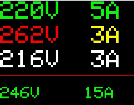 Если в какой либо фазе возникает перегрузка по току или по напряжению, релейный модуль отключает нагрузки в 3-х фазах и информация о напряжении или токе окрашивается в красный цвет.