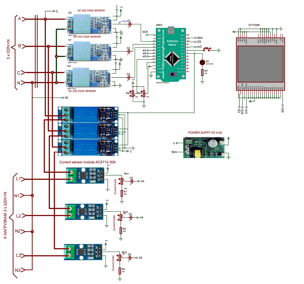 Фазные напряжения измеряются модулями U1,U2,U3. Выходы этих модулей подключены к аналоговым входам А0,А1,А2 Ардуино Нано. Нагрузка каждой фазы подключается через модули измерителей токов ACS71230A, позволяющие измерять переменные токи до 30А. Выходы этих модулей подключены к аналоговым входам А3,А4,А5 Ардуино Нано. Порог срабатывания перегрузки по напряжению устанавливается переменным резистором RV4, перегрузки по току - переменным резистором RV5. Информация отображается на цветном TFT дисплее ST7735.
