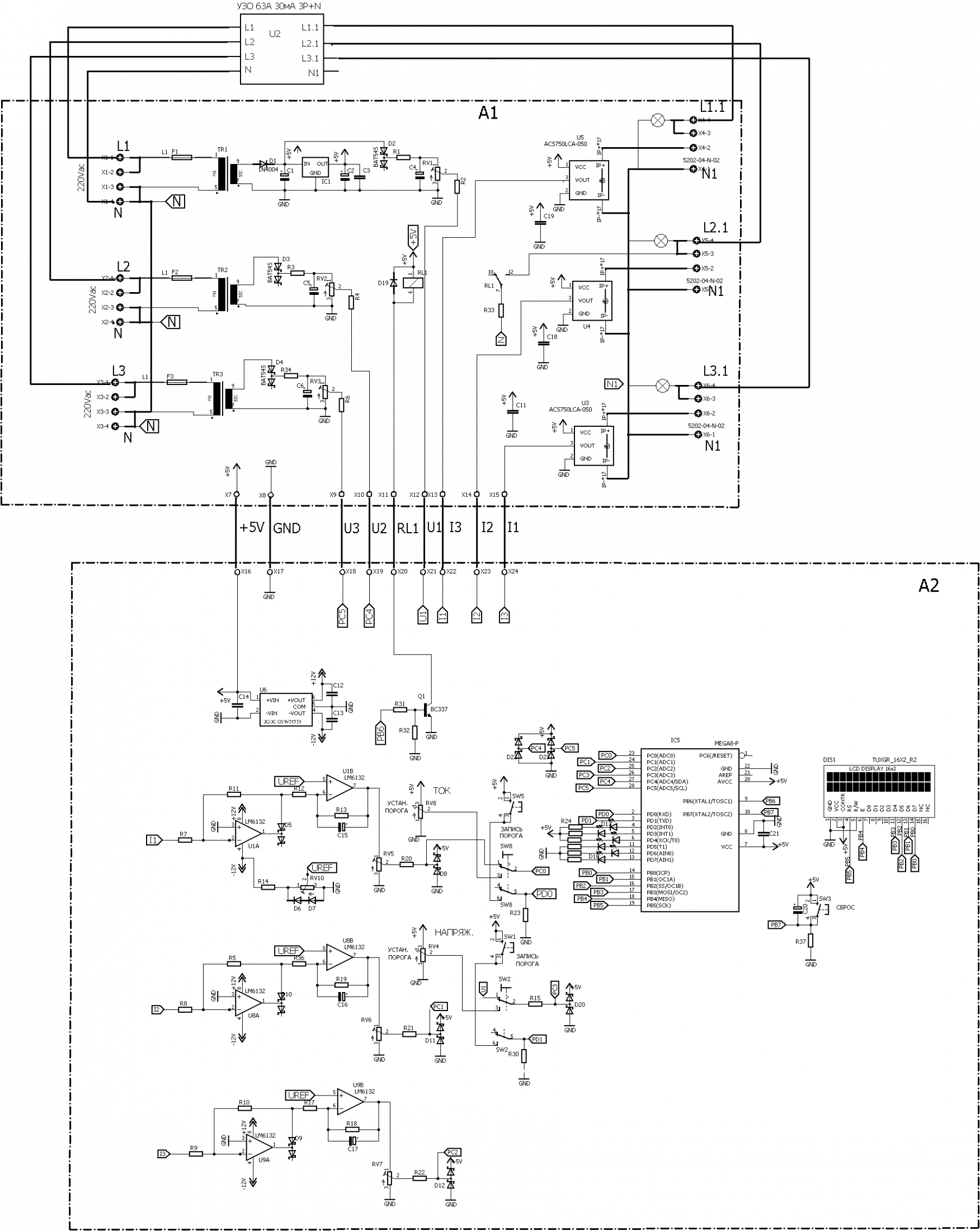 Для отключения нагрузки при превышении предварительно установленных значений напряжения или тока до 50А в 3-х фазной сети применяется 3-х фазное устройство защитного отключения (УЗО) 63A 3P+N 30mA . Все значения порогов записываются в память микроконтроллера Atmega8. Для индикации значений токов и напряжений в каждой фазе применяется 2-х строчный 16-ти символьный LCD индикатор.