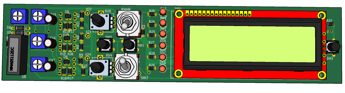 Для установки порога срабатывания эащиты по току необходимо переключатель SW8 переключить в нижнее по схеме положение и потенциометром RV8 установить необходимый порог тока. Это значение отображается в первой цифре верхней строки. Для записи в память необходимо нажать кнопку SW5. Затем необходимо переключить SW8 в верхнее по схеме положение.