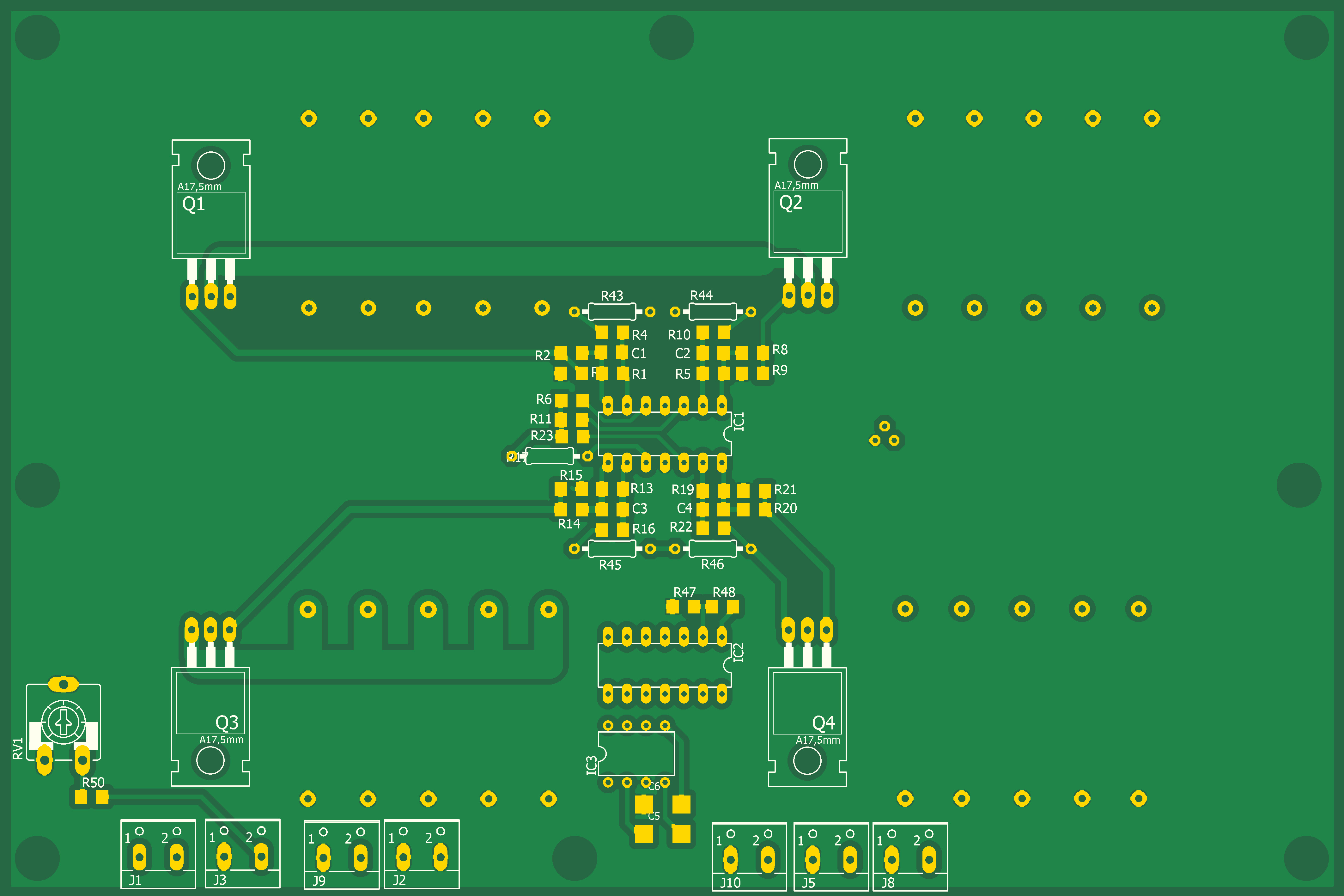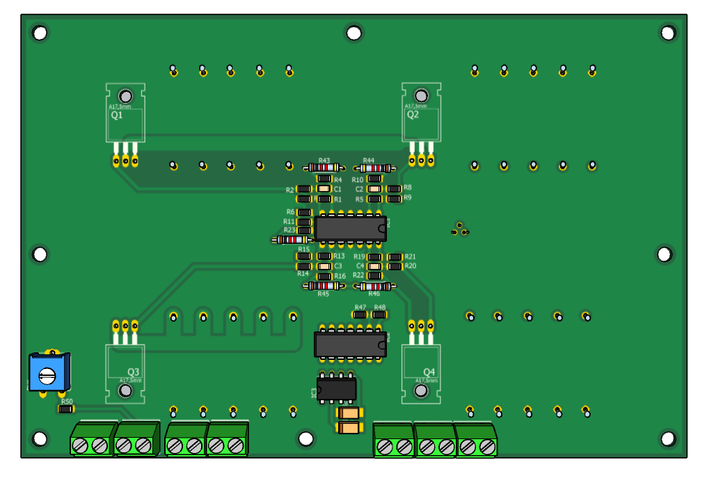 Конструктивно устройство выполнено на 2-х платах - плате управления, где размещены Ардуино Мега, энкодер и кнопки управления и силовой плате, где размещены операционные усилители и силовые транзисторы Q1 - Q4 с 5-ти ваттными керамическими резисторами.