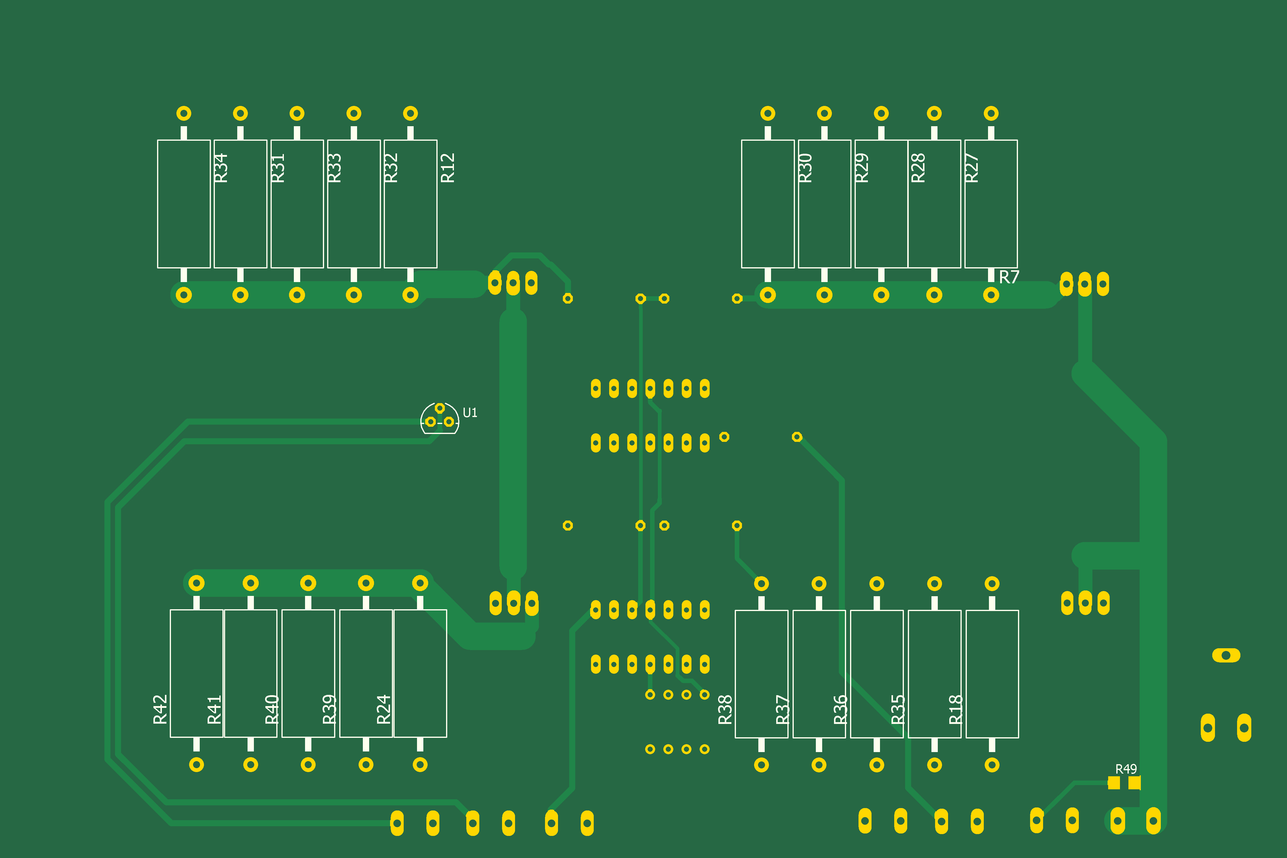 Ток нагрузки устанавливается с помощью энкодера SW1. Код поступает по I2C порту на ЦАП U1. С выхода ЦАП аналоговое напряжение поступает на входы операционных усилителей U2A - U2D. С выходов усилителей управляющее напряжение поступает на затворы силовых полевых транзисторов Q1 - Q4. Сопротивления сток - исток полевых транзисторов а следовательно ток нагрузки зависит от выходного напряжения операционных усилителей. Для измерения тока нагрузки напряжения с 5-ти ваттных керамических резисторов через суммирующие резисторы R43, R44, R45, R46 постпают на вход операционного усилителя U3. С выхода этого усилителя напряжение поступает на аналоговый вход А0 Ардуино Мега. Микросхема U5 преобразует напряжение +12В в -12В.