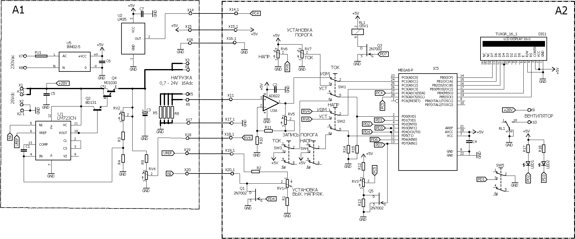 При превышении любого установленного порога на выходе PD4 микропроцессора появляется лог.1, открывается полевой транзистор Q1 и выходное напряжение блока питания отключается. При перегрузке по току загорается светодиод LED1, при перегрузке по напряжению - светодиод LED2. Для отображения значений выходного тока, напряжения и порогов применен однострочный 16-ти символьный LCD дисплей