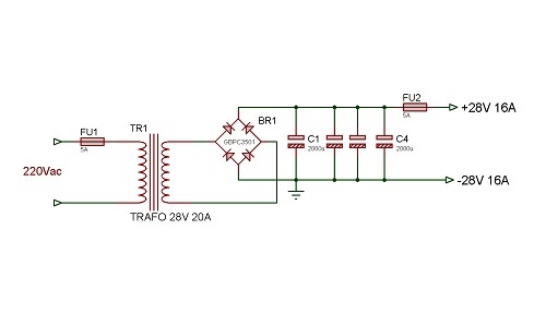 Для питания устройства от 220Вас можно применить классическую схему с понижающим трансформаторот мощностью 600вт, с выпрямительным мостом и сглаживающими электролитическими конденсаторами.