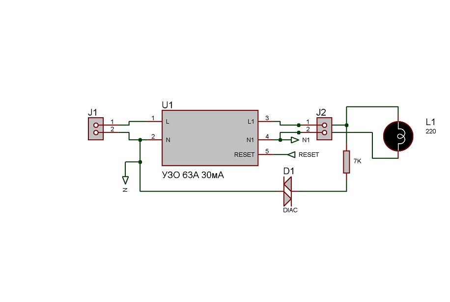 При достижении эффективного значения входного напряжения выше 300В включаетсмя динистор D1, между фазой и нейтралью включается резистор 7кОм искусственно создавая ток утечки более 30мА и УЗО срабатывает.