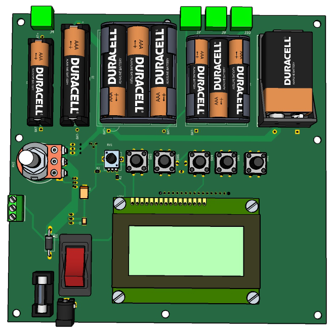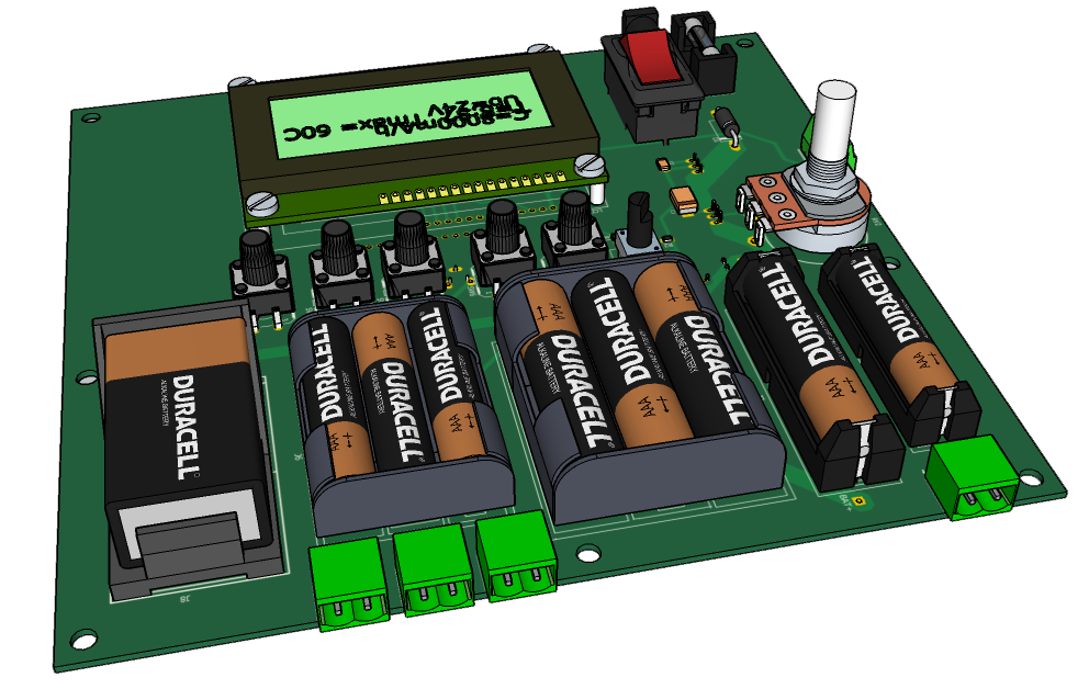 Зарядка осуществляется постоянным током от источника тока на микросхеме U3 LM317. Ток устанавливается переменным резистором RV2. Резисторы R5,R7, R13,R8,R14,R9,R15,R10,R11,R16 ограничивают ток для каждого аккумулятора. Время заряда устанавливается SW6 UP и SW2 DOWN. Зарядка начинается нажатием кнопки START. После нажатия кнопки START необходимо переменным резистором RV2 установить ток заряда и кнопками SW2 и SW6 установить необходимое время заряда. Эти параметры устанавливаются согласно рекомендациям производителей аккумуляторов. Емкость аккумулятора вычисляется по формуле