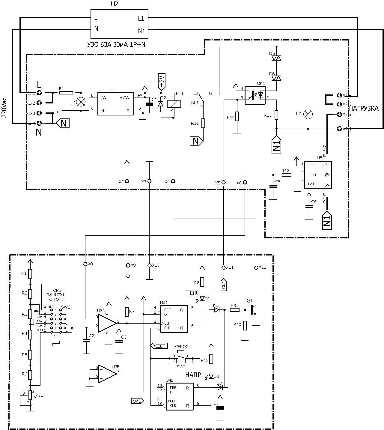 Ток нагрузки измеряется датчиком тока U5, который выдает при максимальном токе 50А напряжение на выходе 5В. Это напряжение поступает на положительный вход компаратора U3. Если оно превышает предварительно установленное пеереключателем значение, на выходе компаратора появляются положительные импульсы, D-триггер U4 устанавливается в лог.1, открывается транзистор Q1 и включается реле RL1. Cвоими контактами оно подключает выход L1 УЗО к нейтрали N через резистор R11 величиной 6К8, тем самым искусственно создавая ток утечки 30мА. В результате УЗО отключает нагрузку от сети переменного тока и включается индикатор D1 ТОК.