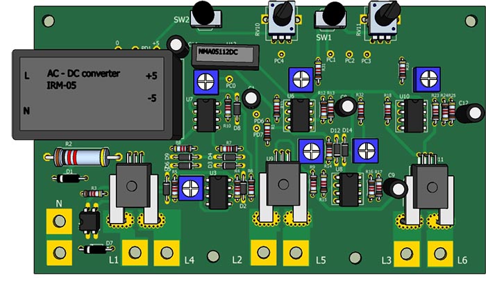 на входы АЦП микроконтроллера РС1,РС2,РС3.Таким образом контроллер обрабатывает значения тока каждой фазы, которые отображаются во 2-й строке дисплея. При превышении тока какой-либо фазы больше установленного потециометром RV10 на выходе РВ6 появляется лог.1 , включается бузер и реле RL1.