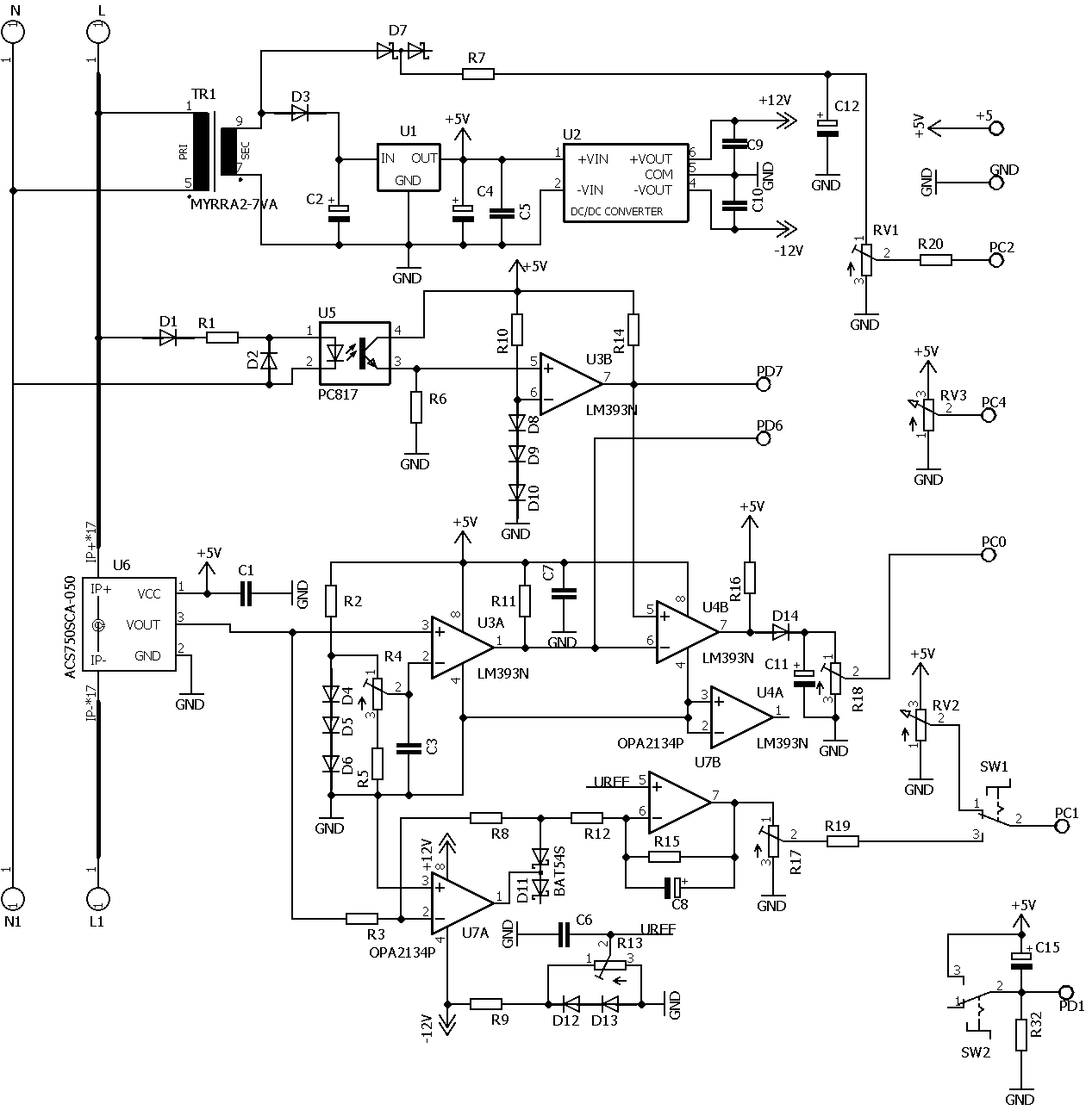 Блок питания состоит из трансформатора TR1, стабилизатора напряжения U1 с выжодным напряжением 5В, DС-DC конвертора U2 с выходными напряжениями ±12V.