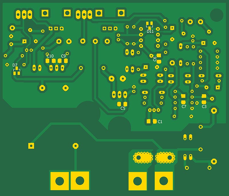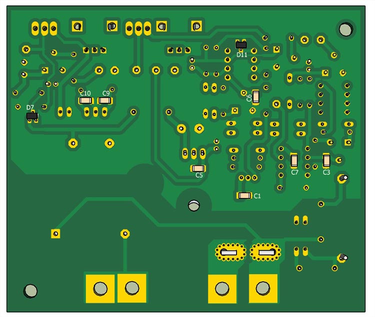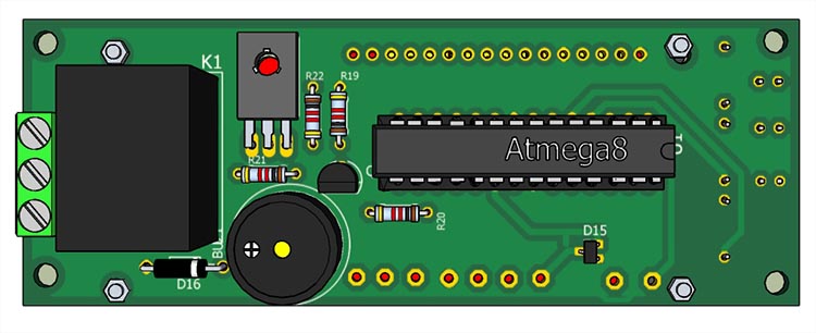 Напряжение, пропорциональное величине тока с выхода трансформатора тока U6 поступает на вход выпрямителя, состоящего из операционного усилителя U7 c диодом D11. Такая схема позволяет существенно повысить линейность выпрямителей. Выпрямленное напряжение поступает на вход АЦП микроконтроллера РС1.Таким образом контроллер обрабатывает значение тока фазы, которое отображается во 2-й строке дисплея. При превышении тока фазы больше установленного потециометром RV3 на выходе РВ6 появляется лог.1 , включается бузер и реле RL1. Любое превышение тока фиксируется включением светодиода D18.Cветодиоды выключаются нажатием кнопки SW2. Для установки порога срабатывания необходимо нажатием SW1 переключить в положение НАСТР, регулятором RV3 установить по показаниям LCD индикатора необходимое пороговое напряжение и регулятором RV2 включить светодиод D16.