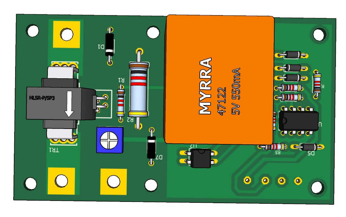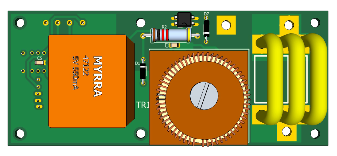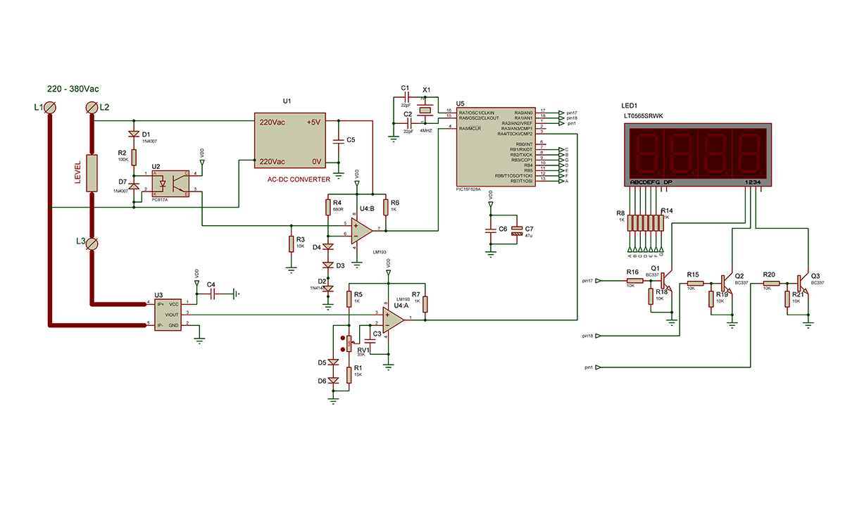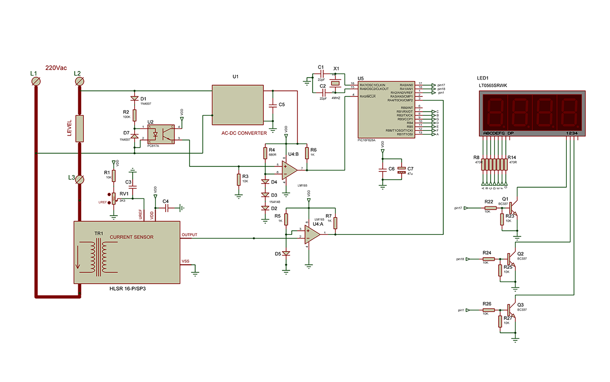Принцип измерения основан на фиксации моментов появления импульсов напряжения и тока, вычислении разницы в радианах и конвертация в коэффициент мощности. Идея и прошивка заимствована из источника. Доработке подверглась схема формирования импульсов напряжения и тока. Доработка позволила повысить точность формирования импульсов. Импульс напряжения формируется оптроном U2 и компаратором U4B и поступает на вход RA5 микроконтроллера. Импульс тока формируется с помощью трансформатора тока TR1 и компаратора U4А и поступает на вход RA4. Прибор питается от AC-DC конвертера U1.