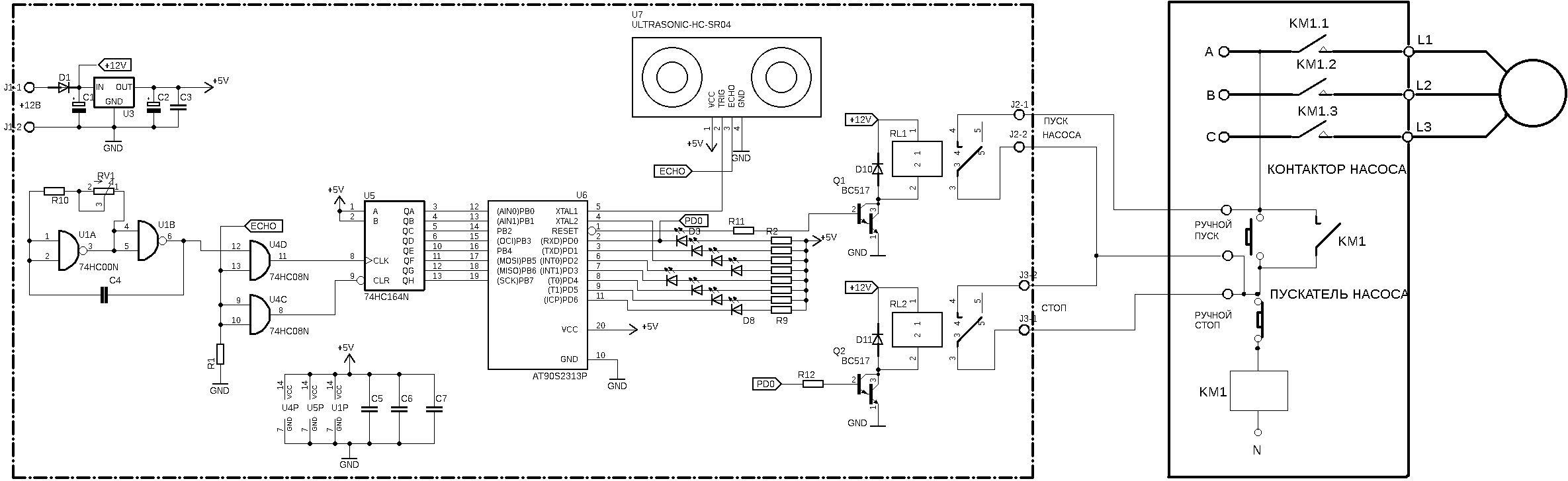 Принцип работы состоит в том, что микропроцессор генерирует короткие импульсы TRIG, которые периодически запускают передатчик сенсора. Передающая мембрана начинает генерировать сигнал с частотой около 40кГц. Этот сигнал отражается от поверхности воды и поступает на премную мембрану.Приняв этот сигнал, сенсор выдает импульс ECHO. Длительность импульса ECHO пропорциональна расстоянию до поверхности воды. Этот импульс запускает и останавливает генератор импульсов U1 и запускает и сбрасывает сдвиговый регистр U5.