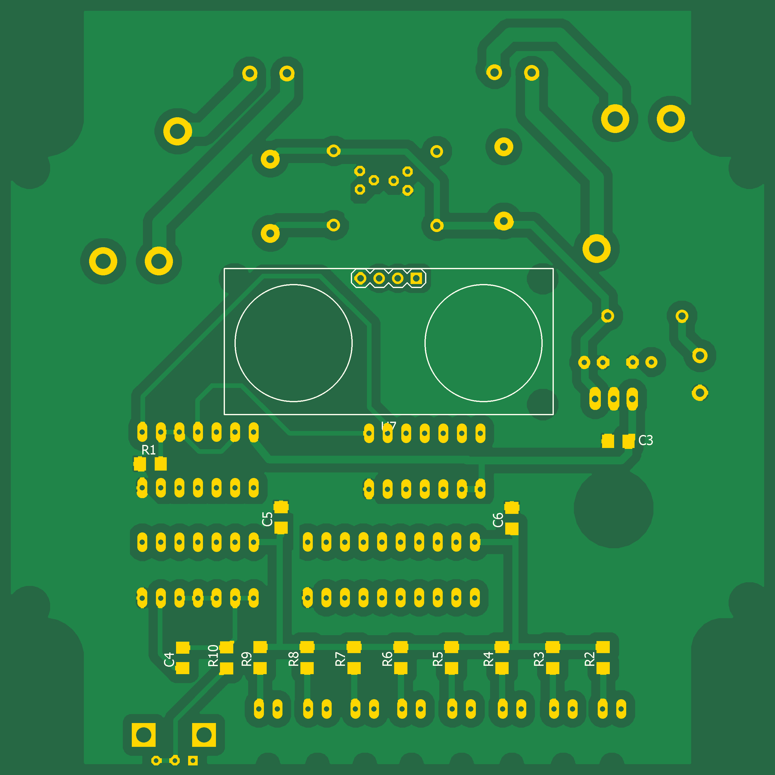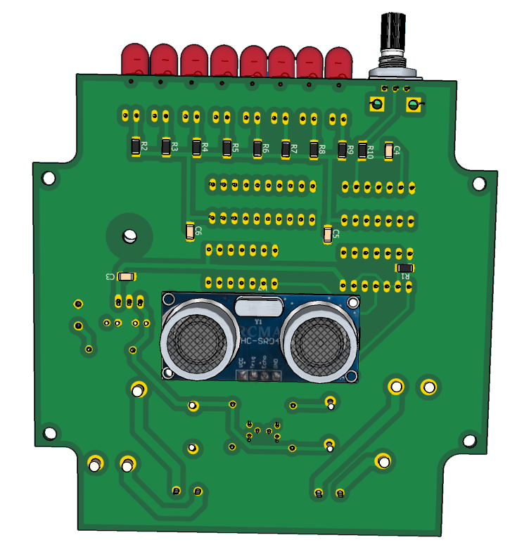 Таким образом, количество импульсов на выходе сдвигового регистра зависит от длины импульсов ECHO. Импульсы с выходов сдвигового регистра U5 поступают на входы РВ0....РВ7 микропроцессора Atmega2313. Микропроцессор вносит задержку включения светодиодов для удобства индикации. Он работает с внутренней тактовой частотой 8мГц.