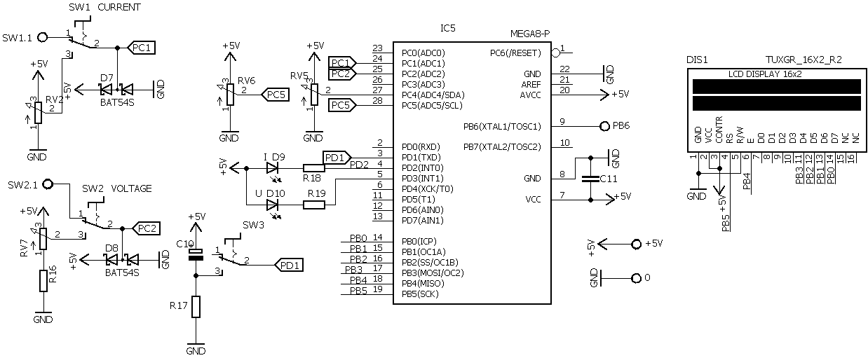 Аналогично можно настроить порог срабатывания защиты потоку.Нажать кнопку SW1. Подстроечным резистором RV2 установить по показаниям LCD индикатора желаемый порог. Затем подстроечником RV5 добиться переключения светодиода D9. Отжать кнопку SW1.