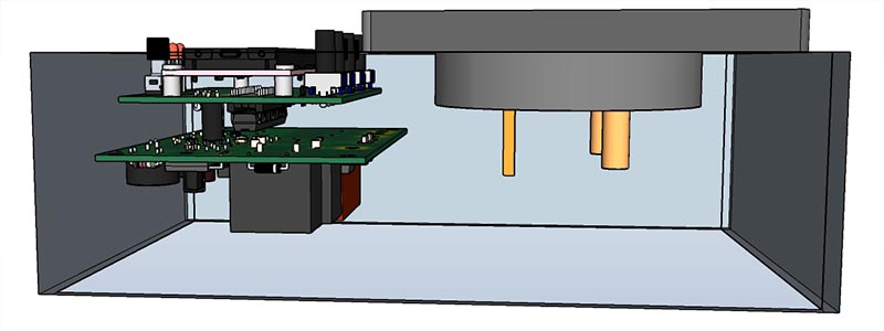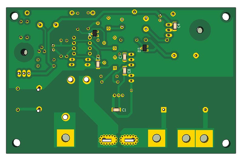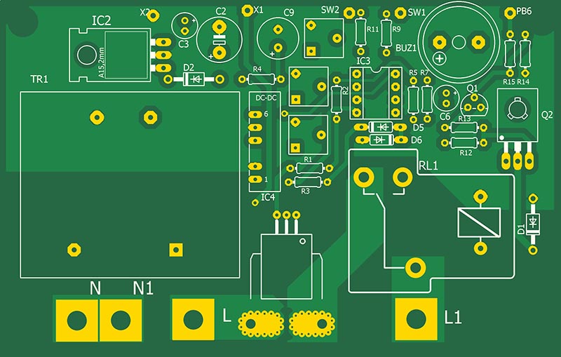 Питание осущетвляется с помщью траннсформатора TR1, выпрямительного диода D2, стабилизатора IC2 с выходным напряжением 5В и DC-DC конвертора с выходными напряжениями ±12В для питания операционного усилителя. Прошивка разработана в среде HORIZONT CONFIGURATOR. Устройство выполено на 2-х платах - плата входная и плата индикации.