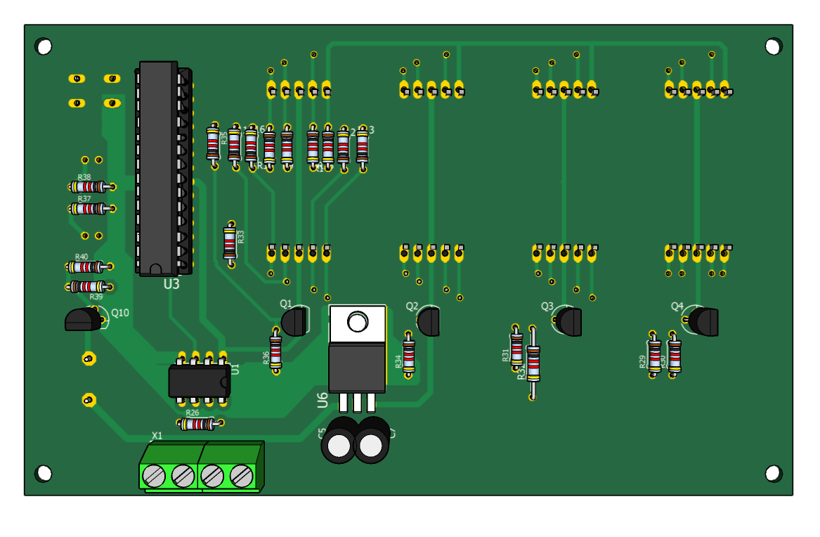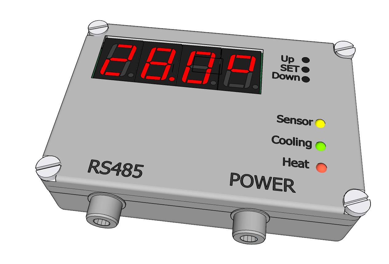 Идея и прошивка найдена на прсторах интернета. Устройство состоит из 2-х блоков - передатчика с температурным сенсором и приёмника. В оригинале связь между передатчиком и приемником осуществляется по радио. В данной статье предлохена двухпроводная связь через интерфейс RS485. Кроме того к анодам семисегментных индикаторов добавлены транзисторы Q1 - Q4, Q6 - Q9, что позволяет использовать более мощные индикаторы, на плате передатчика установлены блок питания и реле для включения нагревателя термостата.