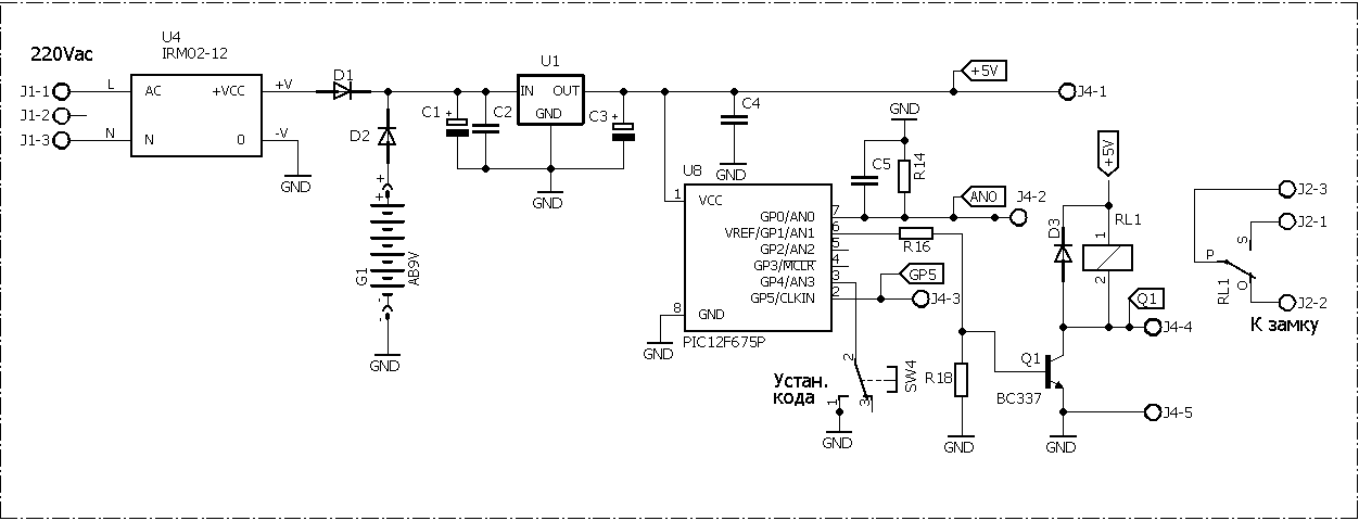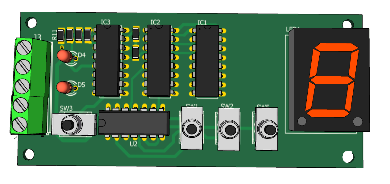Програмируется код очень просто: нажимаем кнопку SW4 "Установка кода" и удерживаем пока не загорится светодиод D5, после чего вводим 4-х значный код с помощью кнопок SW1 и SW2 .После набора каждого числа нажимаем "Ввод". Все новый код запрограмирован ( кому не понятно,смотрите Видео работы внизу статьи)