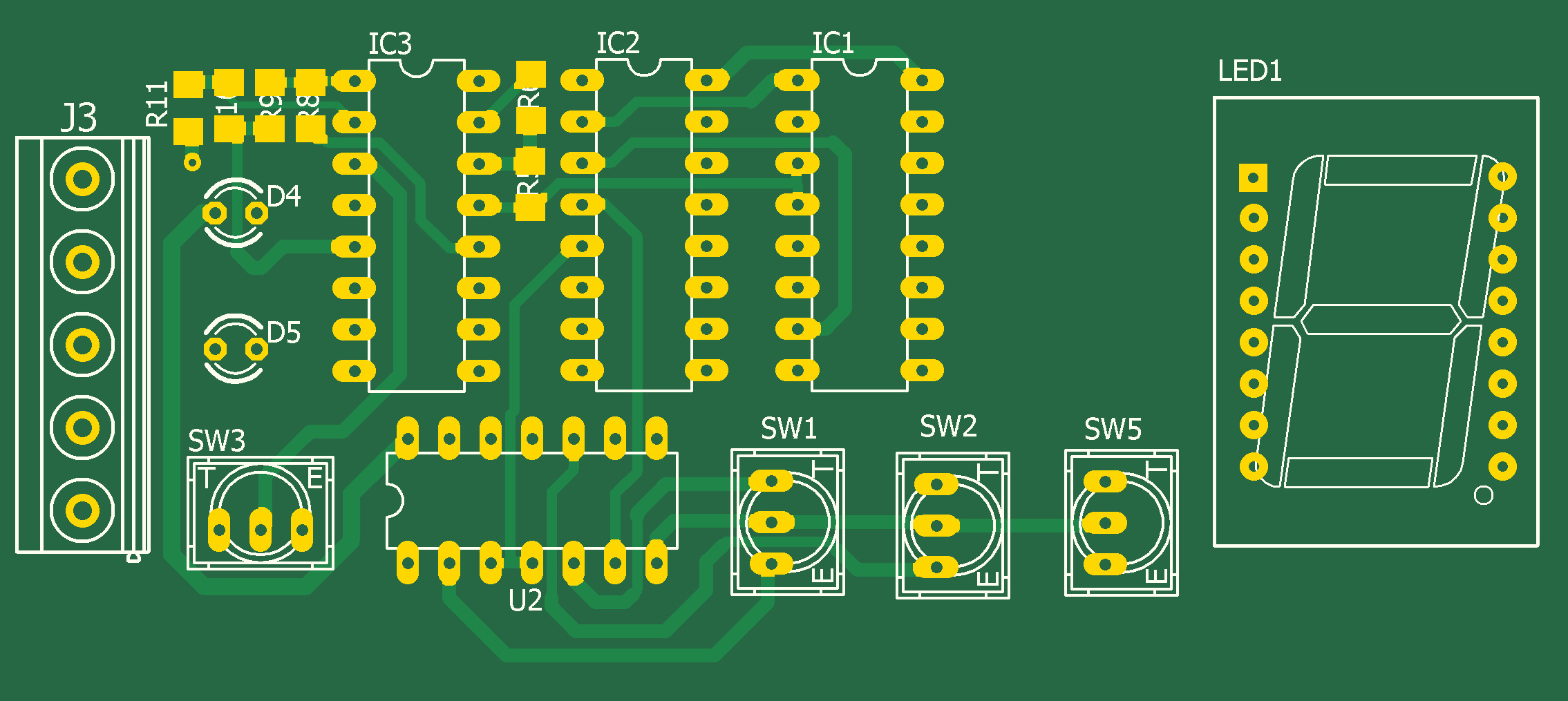 Набор числа производится с помощью кнопок SW1 и SW2. Во избежании влияния дребезга контактов кнопки подключены ко входам Up Down двоичного счетчика IC2 через RS- триггеры U2. Двоичный код с выхода IC2 поступает на семисегментый индикатор LED1, который служит для индикации установленного числа и на счетчик аналогового мультиплексора IC3, который переключает резисторы R5 - R11. Выход мультиплексора подключен к аналоговому входу микроконтроллера. Таким образом каждому установленному числу соответствует свое значение напряжения. Все эти значения записываются при програмировании в микроконтроллер, после чего он реагирует только на них.