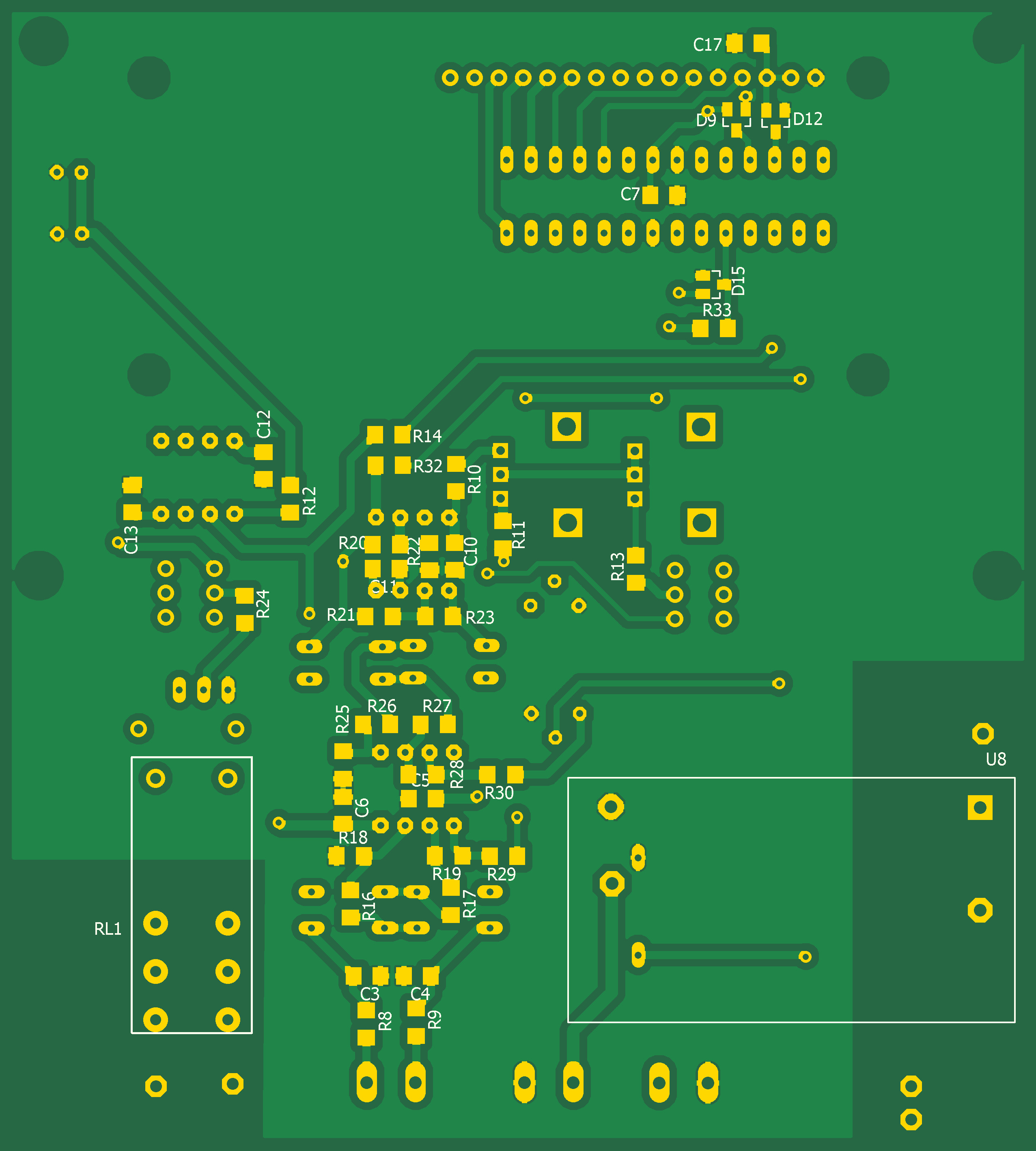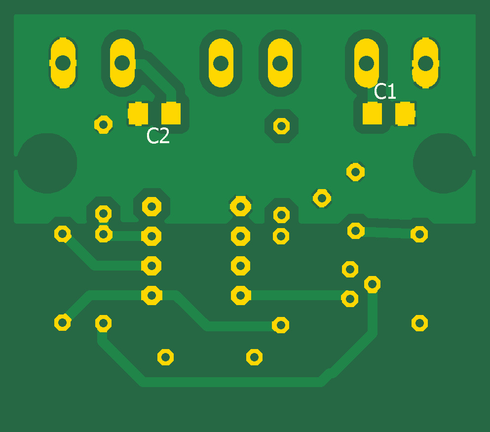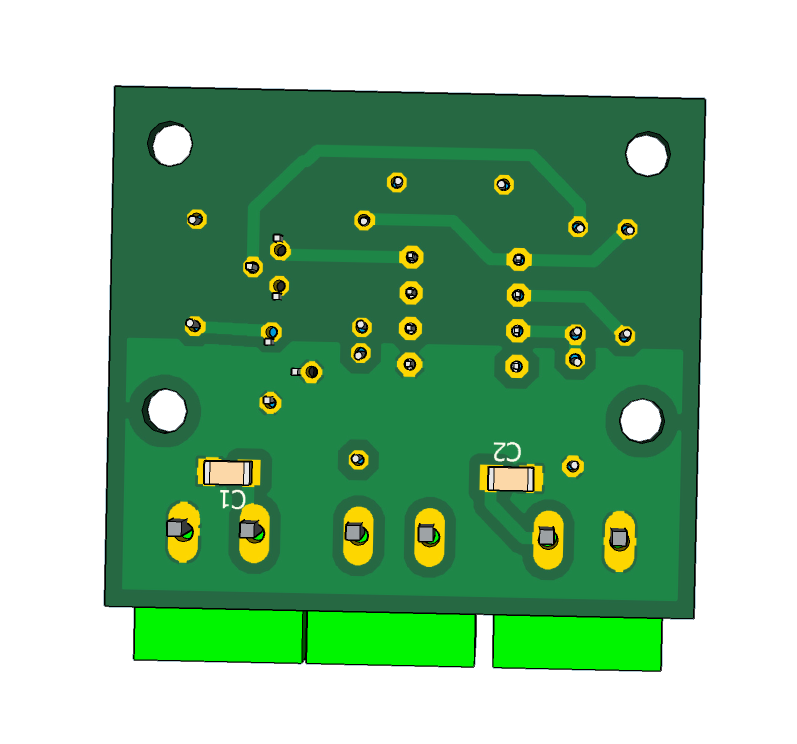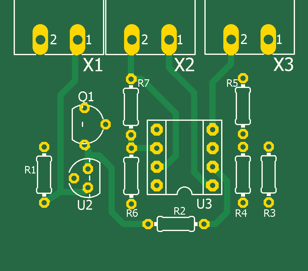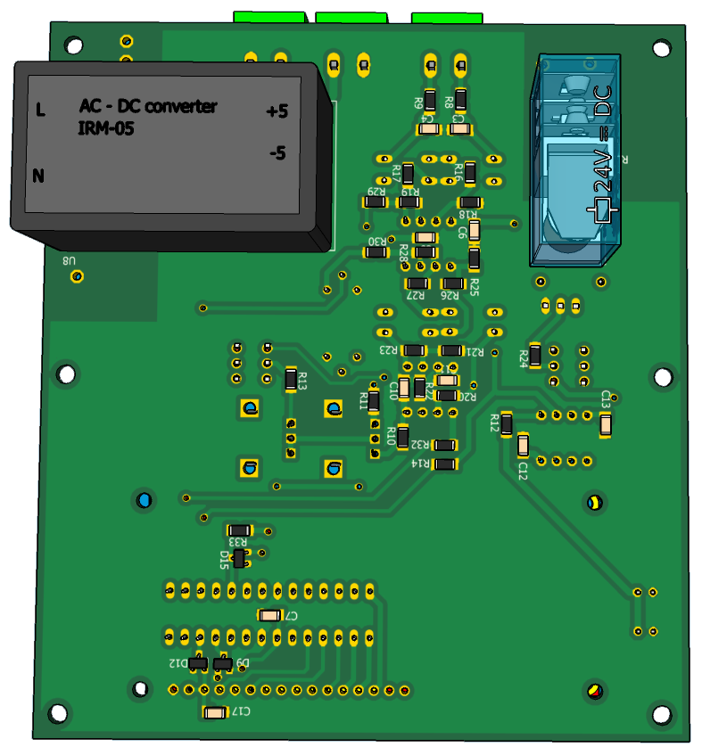 Датчик температуры LM35 включен с подпоркой на транзисторе Q1. При температуре 0 °C на выходе усилителя U3 напряжение 0В. При температуре -40 °C на выходе -4В, при +120 °C напряжение +12В. Выносная плата подключается к термостату с помощью экранированного кабеля с витой парой. Это позволяет подавлять синфазные помехи. Длина кабеля до 8-ми метров. Схема работает аналогично предыдущей, с той разнице, что для индикации отрицательных температур применяются диодный мпст на диодах Шоттки D1 - D4 , для индикации порогов вулючения и выелючения нагревателя - диодный мпст на диодах Шоттки D5 - D8. Питание с помощью AC DC конвертера IRM-05-15 с выыходным напряжением 15В и током 300мА.