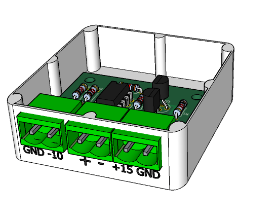 Выносная плата подключается к термостату с помощью экранированного кабеля с витой парой. Это по зволяет подавлять синфазные помехи. Длина кабеля до 8-ми метров. При температурах от -40 до 0 °C напряжение на выходе выносной платы -4В - 0В, при температупах 0 - 140 °C от 0 до 14В . Схема работает аналогично предыдущей, с той разнице, что для индикации отрицательных температур применяются диодный мпст на диодах Шоттки D1 - D4 , для индикации порогов вулючения и выелючения нагревателя - диодный мпст на диодах Шоттки D5 - D8. При отрицательных температурах включаются сетодиодц D9, D10 и D13,D14 Питание с помощью AC DC конвертера IRM-05-15 с выыходным напряжением 15В и током 300мА.