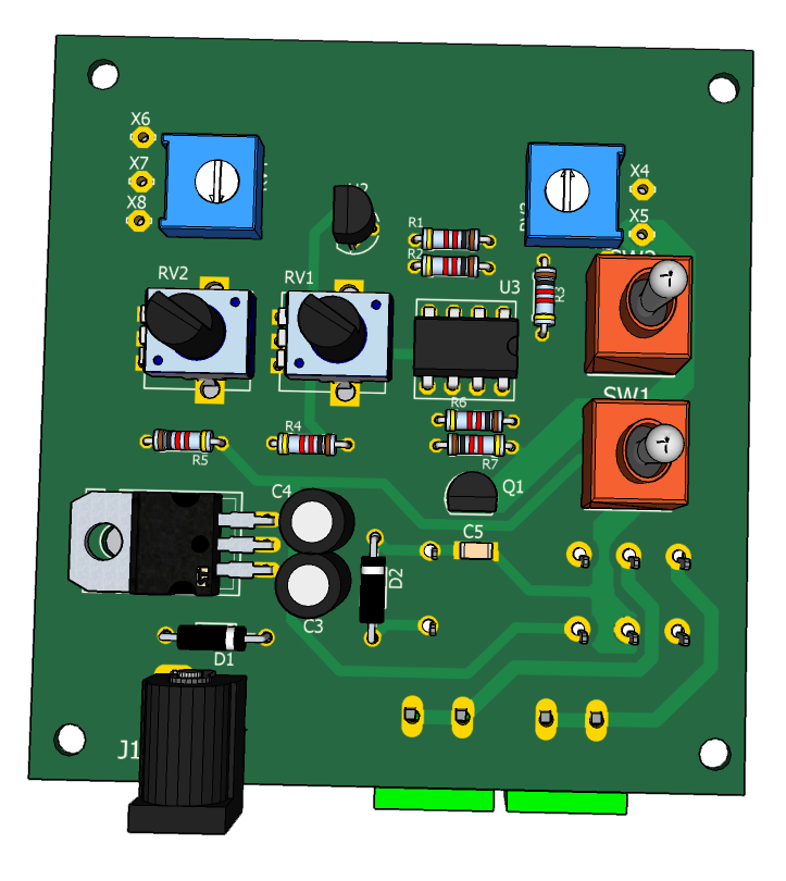 Для настройки термостата с помощью подстроечного резистора RV3 установить показания 7-ми сегментного модуля индикатора температуры соответственно показаниям образцового термометра. Затем измерить напряжение на среднем выводе переменного резистора RV1 и подстроечным резистором RV4 установить соответствующее показание на индикаторе порога.