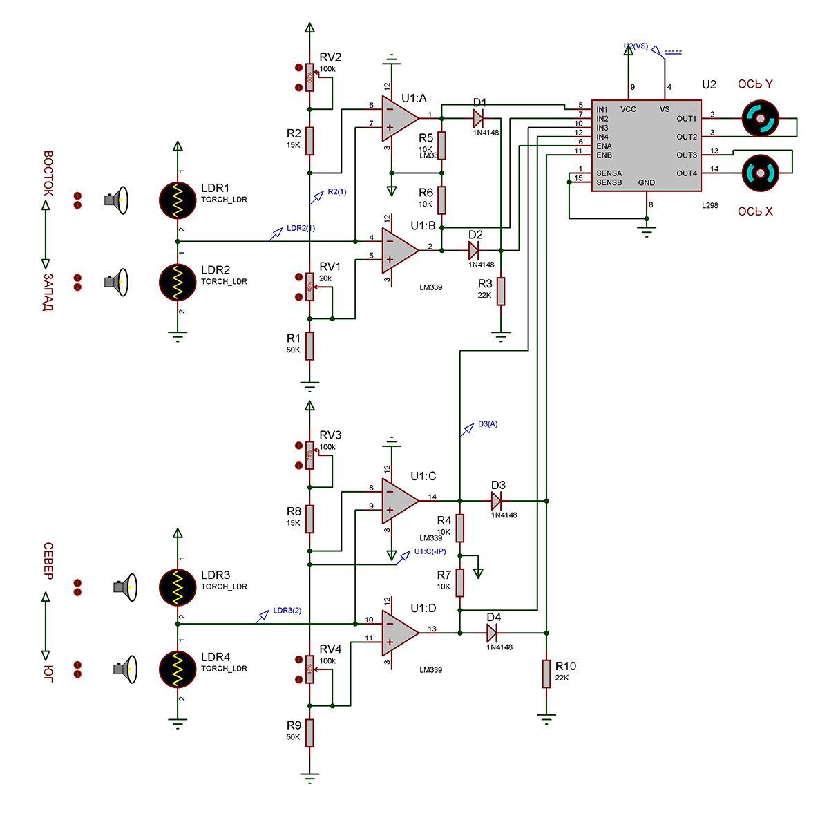 Фоторезисторы LDR1, LDR2 отслеживают движение солнца с востока на запад. Фоторезисторы LDR3,LDR4 с севера на юг. Когда солнце расположено под углом 90° над фоторезисторами, их сопротивления равны, в точках их соединения напряжения 2,5В и на выходах компараторов U1 лог. 0 и моторы не работают. Когда солнце смещается, на выходе соответствующего компаратора появляется лог.1 в зависимости от направления смещения солнца включается соответствующий мотор. Для управления моторами применен драйвер U2 LM298. Подробнее на видео.