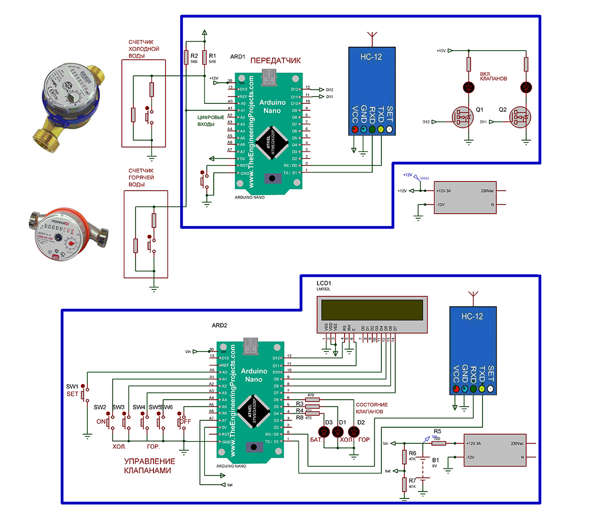 Устройство состоит из передатчика и пульта, выполнененых на Ардуино Нано. Связь осуществляется при помощи радиомодулей НС-12 работающих по UART на частоте 433 мГц. Для учета воды применяются счетчики с импульсным выходом. Каждый импульс должен иметь дискретность 10л или 0,01м3.
