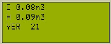 В первой и второй строке показания счетчиков холодной и горячей воды, в третьей строке - дата и время. Для установки даты и времени нажав кнопку SW12 войти в меню. В третьей строке появится пункт меню YER