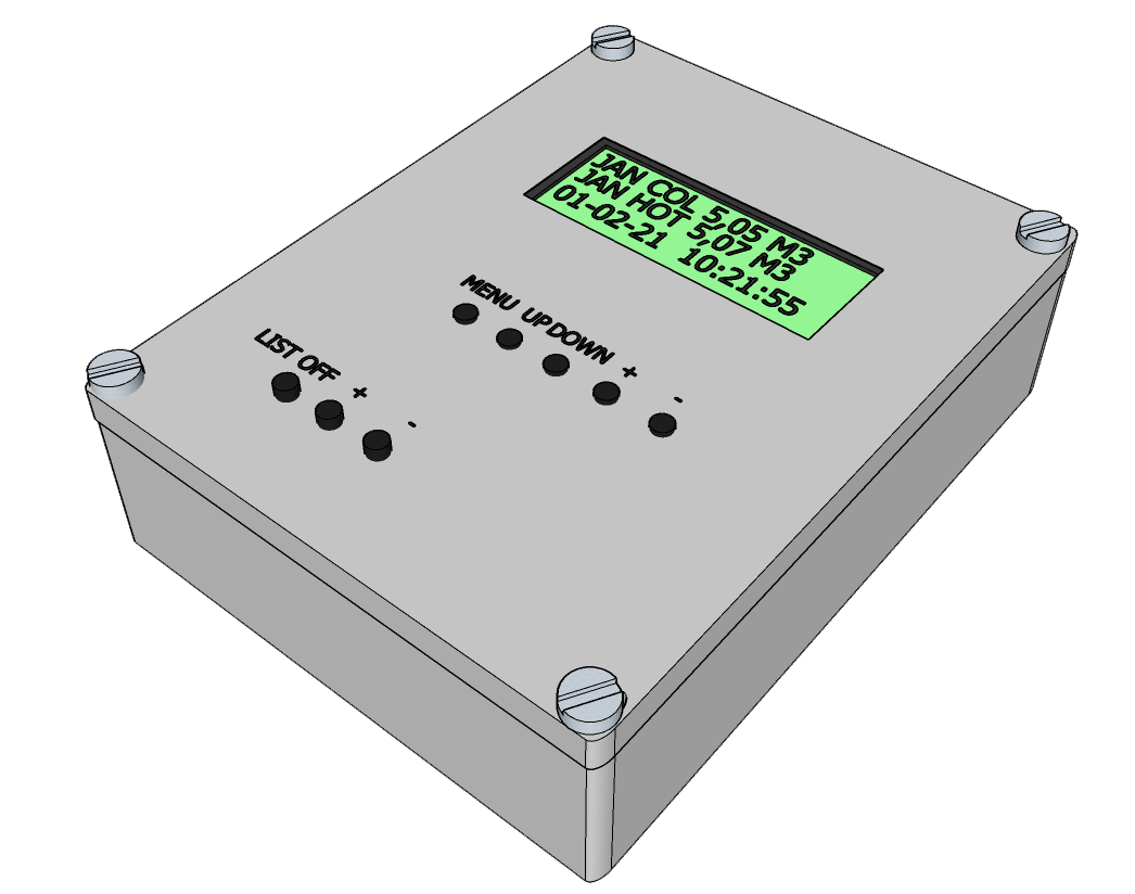 Для записи ежемесячных показаний счетчиков применяется модуль часов реального времени DS1307 подключенный к Ардуино приемника ARD2 через I2C. Вся информация отображается на 4-х строчном 20-ти символьном LCD дисплее.