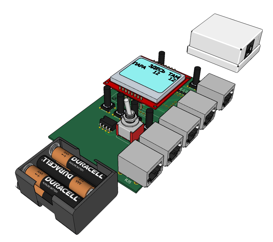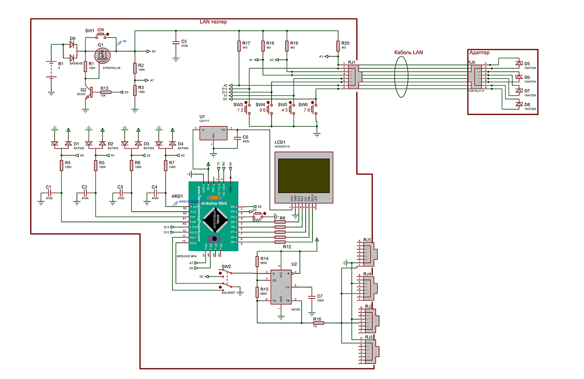 Устройство позволяет проверять состояние кабеля, а также очередность проводов в патч-кордах, сделанных из витой пары (RJ-45 UTP/FTP). Также может осуществляться: тестирование правильности соединения каждого провода в кабеле, проверка правильности обжима, наличия обрыва или короткого замыкания, также определять расстояние до обрыва кабеля. Устройство выполнено на Ардуино Мини. Информация выводится на индикатор NOKIA 5110. Схема приводена ниже
