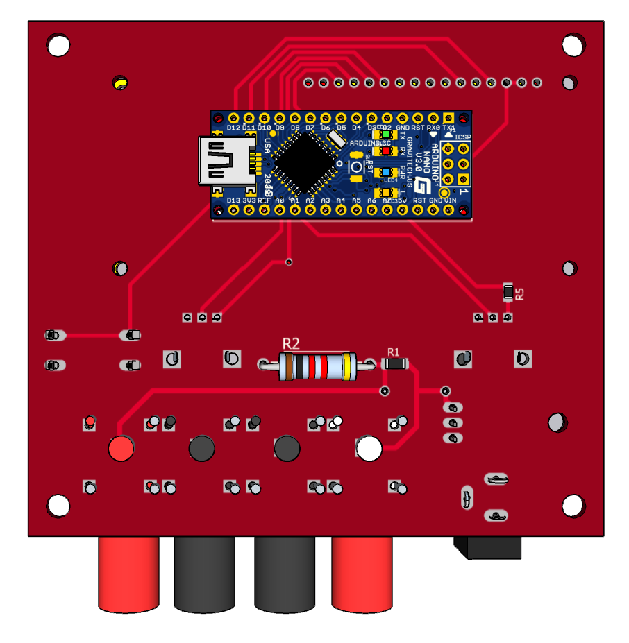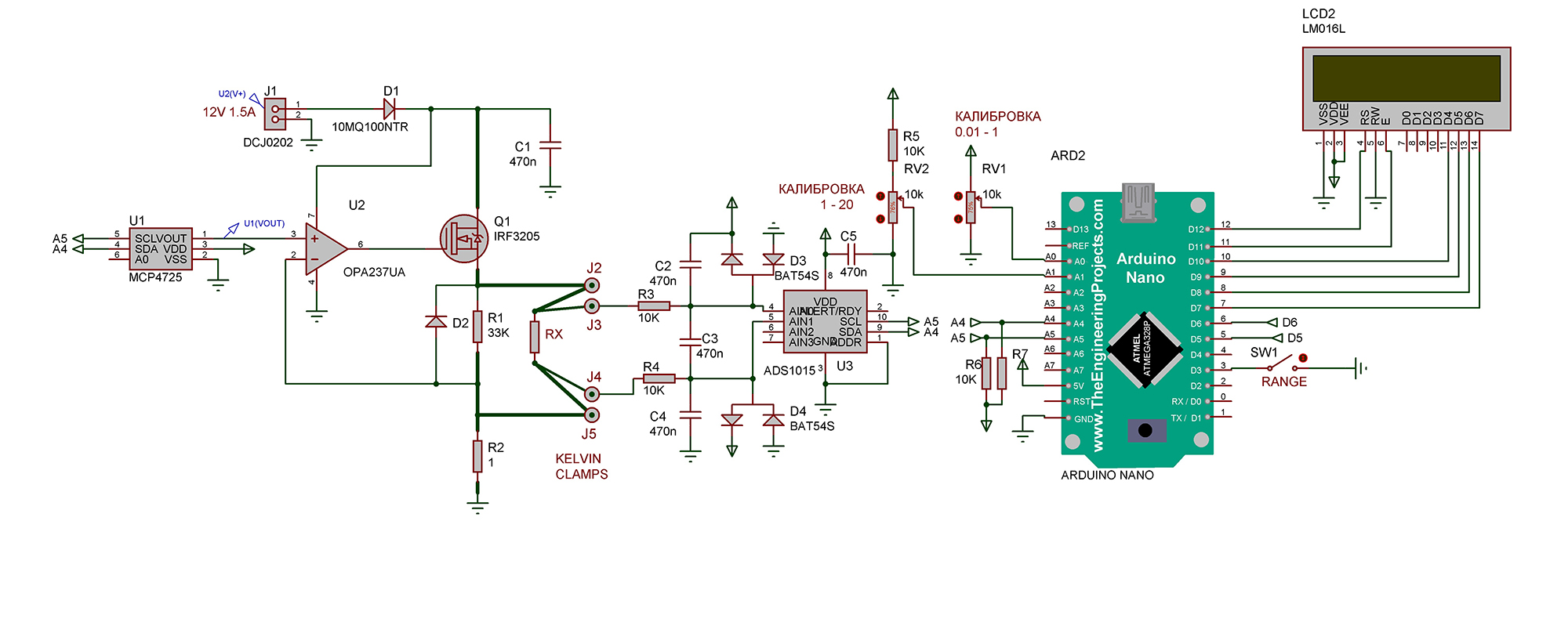 Источник тока выполнен на операционном усилителе U2 и полевом транзисторе Q1. Источник имеет 2 режима. При измерении сопротивления в диапазоне от 0.01 - 1 Ом выходной ток источника - 1А. При измерении сопротивления от 1 до 20 Ом выходной ток 100мА. Это реализовано для повышения точности измерения сопротивления от 0.01 до 1 Ом и для ибежания рассеивания мощности при измерении сопротивления от 1 до 20 Ом. Управляется источник тока кнопкой SW1 с помощью ЦАП U1, подключенному к Ардуино через I2C. Измеряется сопротивление с помощью 4-х проводных зажимов Кельвина. Напряжение измеряетсяс помощью АЦП U3, подключенному к Ардуино также через I2C. Индикация диапазона и значения измеряемого сопротивления осуществляется с помощью 2-х строчного 16-ти символьного LCD дисплея.