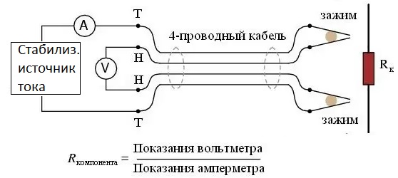 В 4-х проводной схеме прибор автоматически как бы отсекает и первый и второй подводящий провод и измеряет чистое падение исключительно на нагрузке. Схема прибора приведена ниже