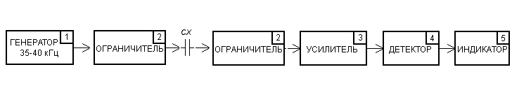 С выхода генератора напряжение через олраничитель-делитель предназначенный для защиты генератора поступает на проверяемый конденсатор Сх. Напряжение на проверяемом конденсаторе прямо пропорционально ЭПС конденсатора. Это напряжение поступает на усилитель, выпрямляется и далее на светодиодный инликатор уровня напряжения.