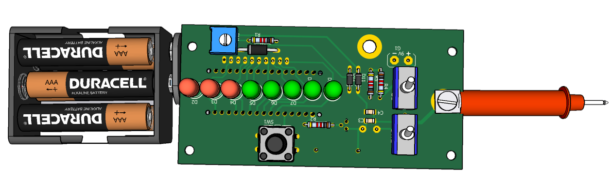 Для определения ESR необходимо к клеммам щупа Сх подключить измеряемый конденсатор. Если емкость конденсатора меньше 47мкФ, переключатель SW2 дорлжен находиться в верхнем по схеме положении, если выше - в нижнем. Затем включить кнопку SW1. Если ESR конденсатора около 1 Ом, включается светодиод D9, если около 20 Ом, включаются светодиоды D9 - D3. Калибровка устройства производится триммером RV1.