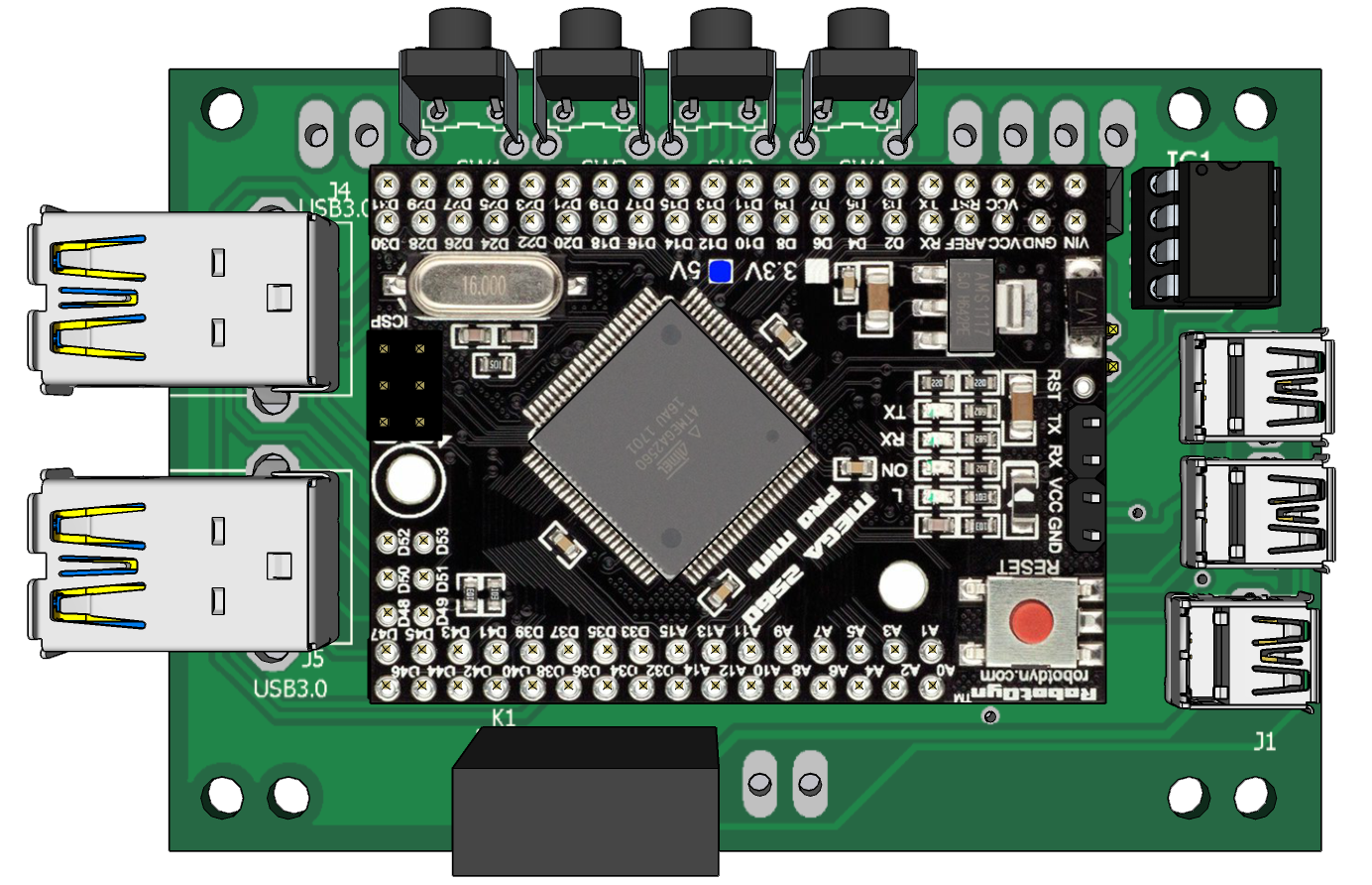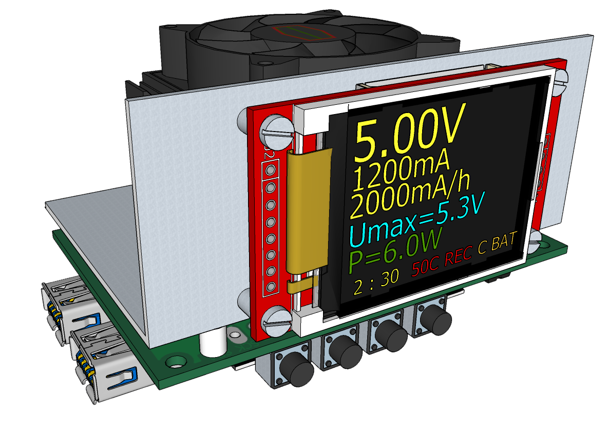 Для тестирования нагрузочной способности USB кабеля к J3 подключить заряженный powerbank, к J4,J5 тестируемый USB кабель. Повышая кнопкой SW1 ток нагрузки фиксировать значение напряжения. Ток при котором напряжение падает более чем на 10% явлляется максимально допустимым для данного кабеля. Для проверки маркировки USB кабеля, наличия обрыва и замыкания жил короткими нажатиями SW3 включить режим CABLE. Переключать жилы можно кнопками SW1,SW2. Подробнее на видео.
