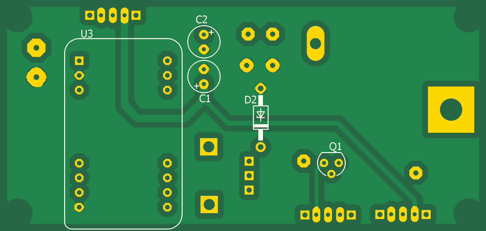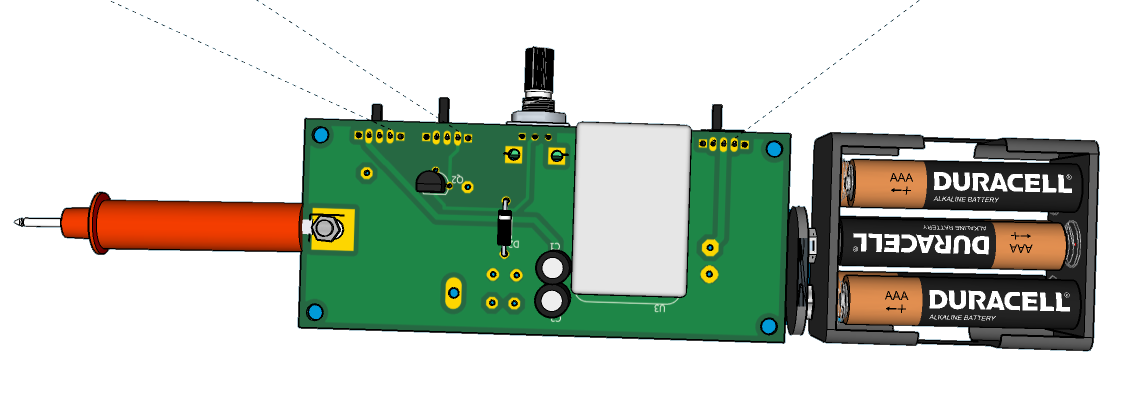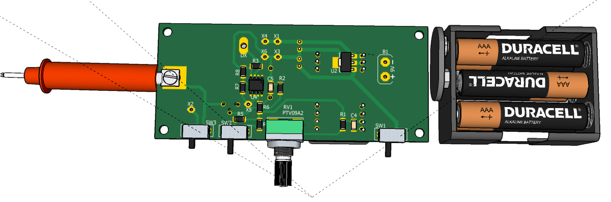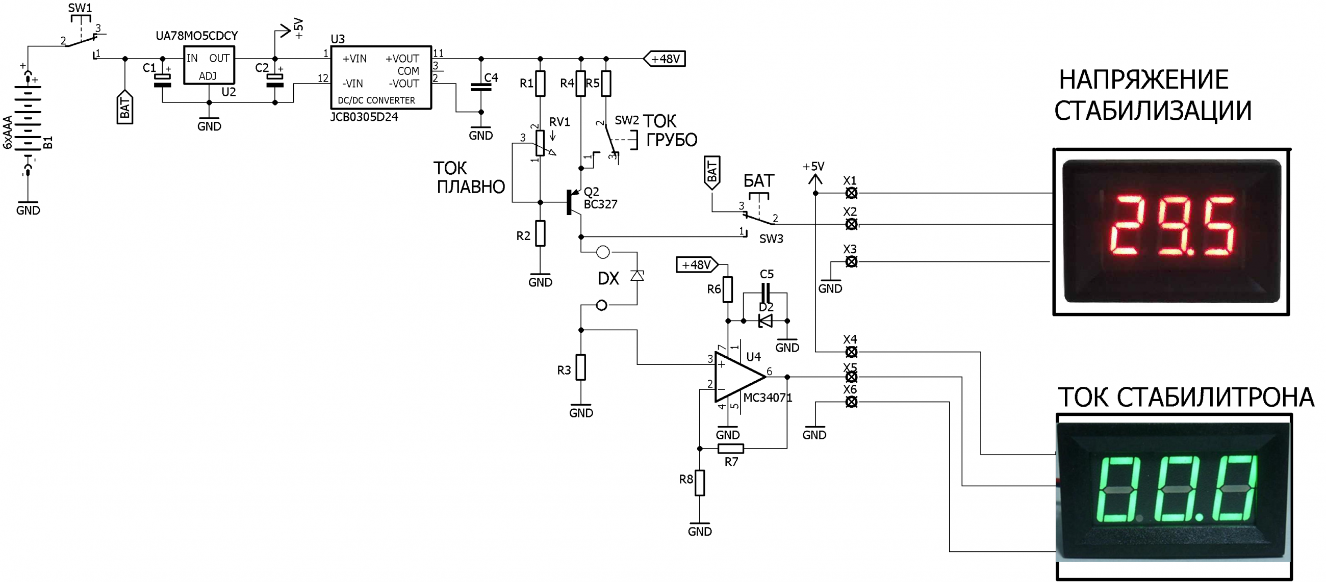 Источник тока с проверяемым стабилитроном подключены к модулю DC-DC конвертера U3 с выходным напряжением 48В и с вхолным напряжением 5В. Питается устройство от аккумулятора 9В. Переключив переключатель SW3 в положение BAT можно проверить напряжение аккумулятора.